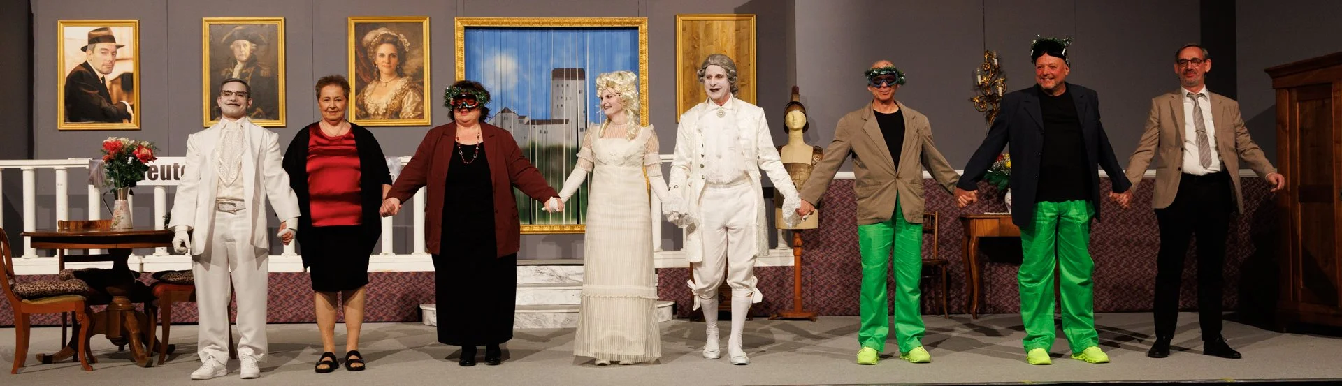 Das Bühnenbild, entworfen und gebaut (mit HelferInnen) von Arthur Blum gibt dem Geschehen einen würdigen und noblen Rahmen. Vor einer besondere Herausforderung standen dieses Mal die Masken- und Kostümbildnerin (Nadine Forster und Kerstin Köck), die die Geister von den „normalen“ Figuren abheben mussten – was ihnen hervorragend gelungen ist. Clemens Bauer sorgte mit seiner eigenen Anlage wieder gekonnt für die richtigen Sound- und Lichteffekte.